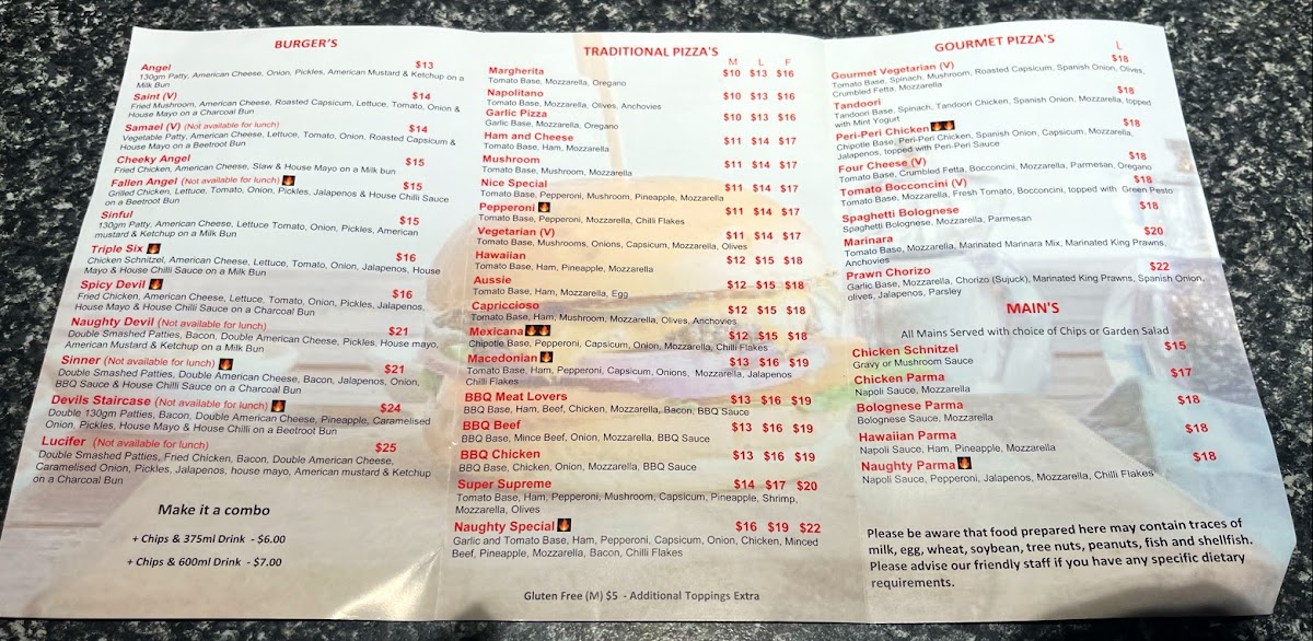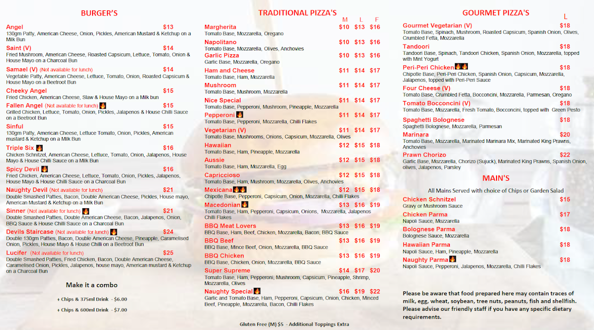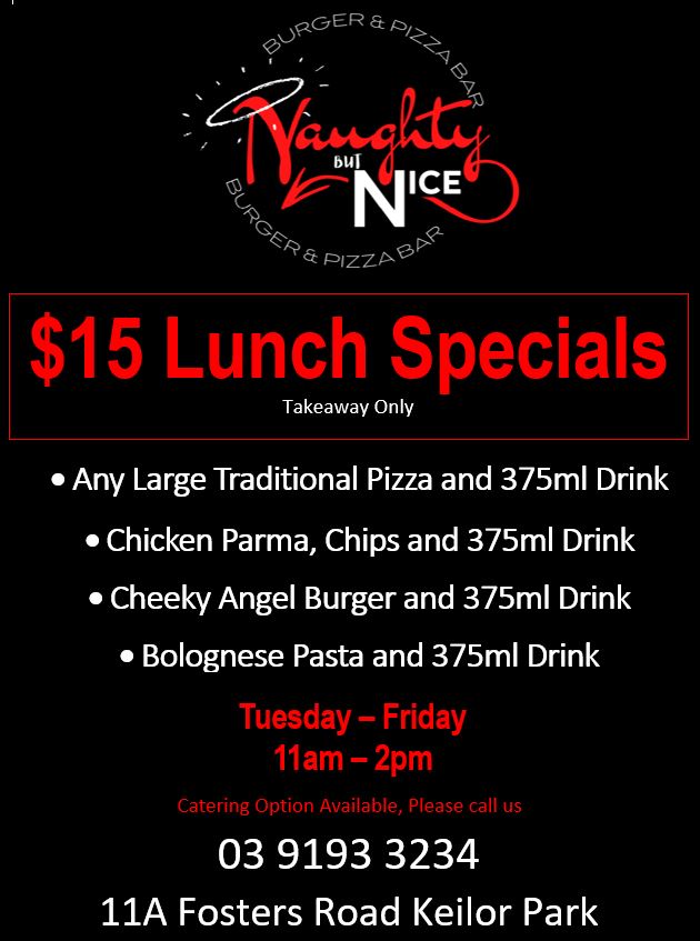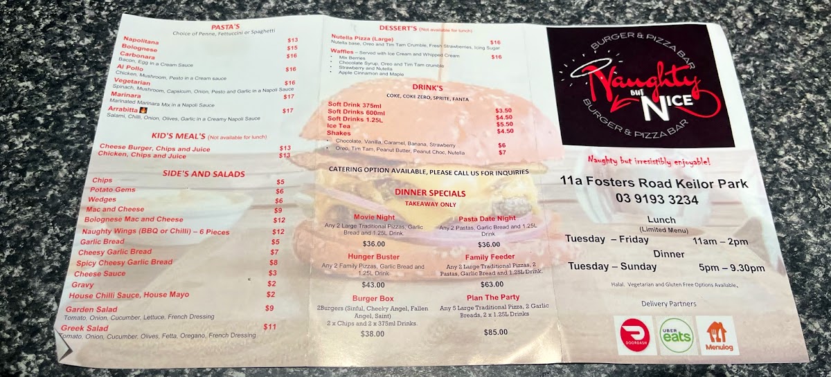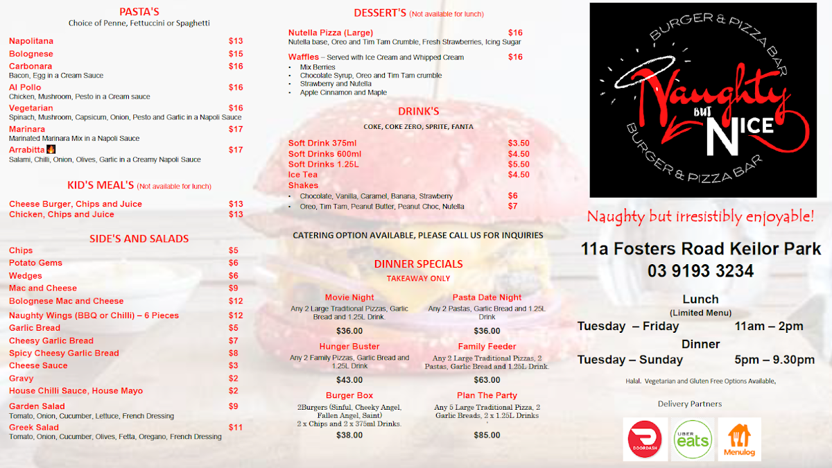 At the heart of Keilor Park, you'll find a place where bold flavors meet a laid-back atmosphere - welcome to Naughty But Nice Burger And Pizza Bar Menu. Whether you’re craving a juicy burger stacked with all the fixings or a cheesy, perfectly baked pizza, this spot has something to satisfy every craving. Their menu brings together a variety of options that cater to all tastes, with fresh ingredients and plenty of choices to mix and match. From their signature burgers to hearty pizzas topped just right, you’ll discover a selection that’s hard to beat. The vibe is relaxed and friendly, making it the perfect place to hang out with friends, grab a bite after a busy day, or treat yourself to something indulgent. The boldness of their flavors will leave you coming back for more!